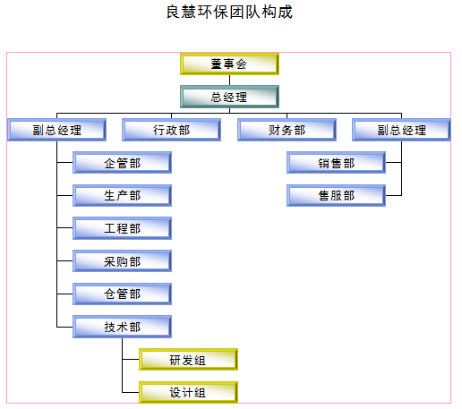 董事会、总经理、副总经理、行政部、财务部、副总经理、企管部、生产部、工程部、采购部、仓管部、技术部、销售部、售服部、研发组、设计组